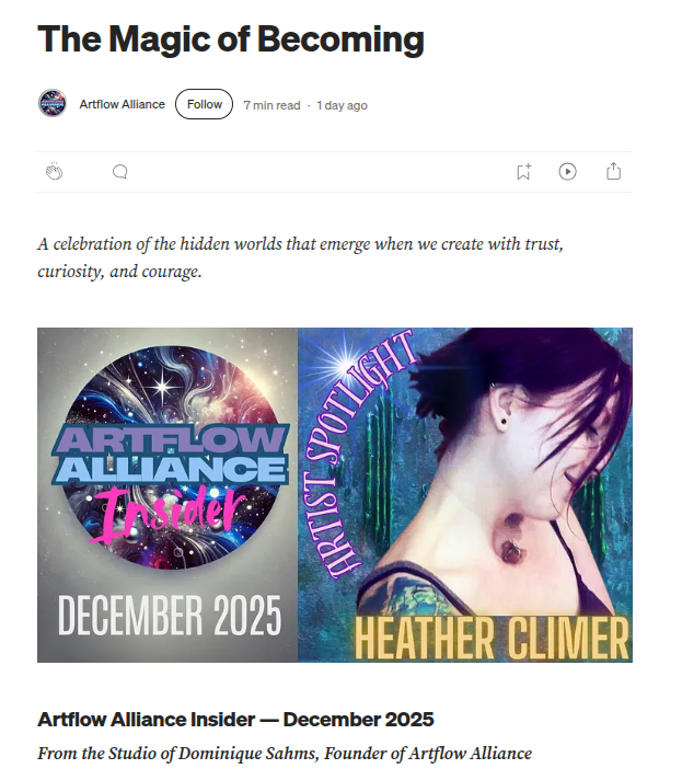 | I am featured in the December 2025 issue of Artflow Alliance Insider, under “Updates & Opportunities”. Check out the great write-up on LinkedIn here or on Medium here. | ![]() |